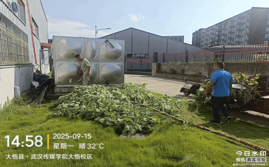 12. 9月18日,大悟校区物业科协调绿化队、保洁队合力疏通爱心湖排水沟,筑牢校园防汛保障。