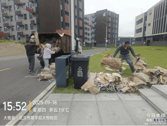 13. 9月18日,针对发书后教室废纸堆积问题,大悟校区物业科一边组织保洁员工高效工作,一边协调垃圾清运车,教室环境恢复如初。