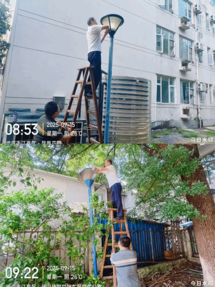 1. 9 月 15 日,武汉校区物业科组织维修师傅们,集中更换东区学生公寓周围损坏的路灯。