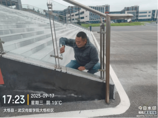 8. 9月17日,大悟校区物业科对T6图书馆,T2教学楼台阶两侧的玻璃护栏进行全面检查与螺丝加固,以消除松动隐患。