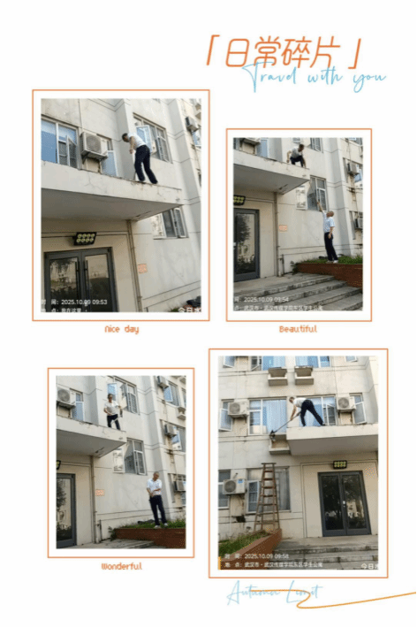6. 10月9日,为确保东区学生公寓雨篷排水功能正常,及时消除潜在的安全隐患,武汉校区物业科维修队组织力量,对该公寓雨篷上堆积的杂物垃圾展开清理工作。