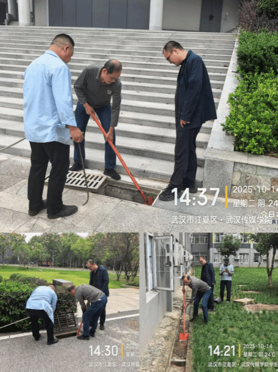 5. 10月14日,为确保校园环境整洁有序,武汉校区宿管科组织宿管员,对各宿舍楼四周的排水沟开展了全面的清淤工作。