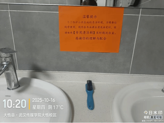 11. 10月16日,大悟校区物业科在洗手池边张贴温馨提示,并准备专用刷。