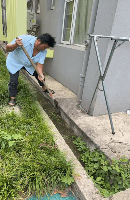 8. 10月15日,物业科李科长亲自带队,组织维修人员对校园内的篦井、雨水井等区域开展积水清理专项工作,旨在有效避免蚊虫滋生,维护校园良好的卫生环境。