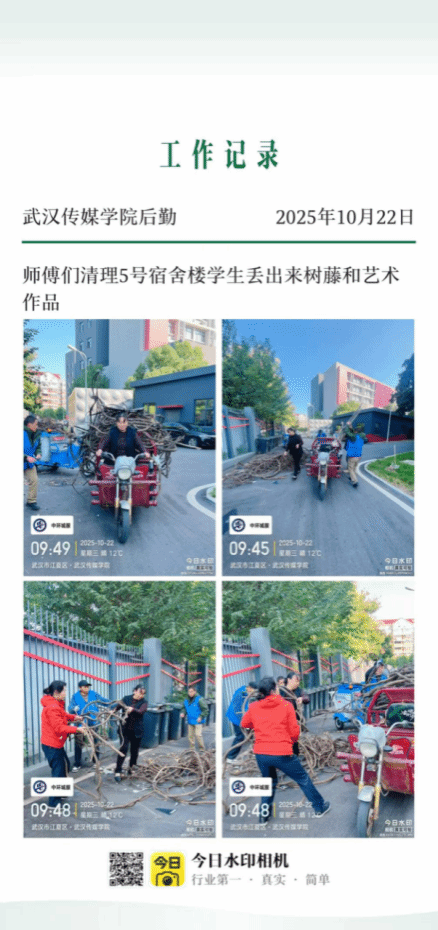 7. 10月22日,武汉校区物业科组织外围工作人员集中清理5号宿舍楼周边学生丢弃的树藤。