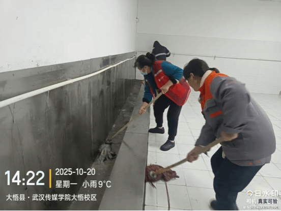 2. 10月20日,大悟校区物业组织保洁人员,严格遵循清洁工作规范,采用草酸对室内运动场厕所展开了全面且深入的刷洗作业。