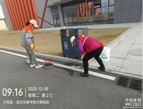 6. 12月9日,大悟校区物业科聚焦校内果皮箱周边顽固难除的污渍问题,开展专项清理行动,组织保洁人员撒下洗衣粉,手持刷子反复刷洗。