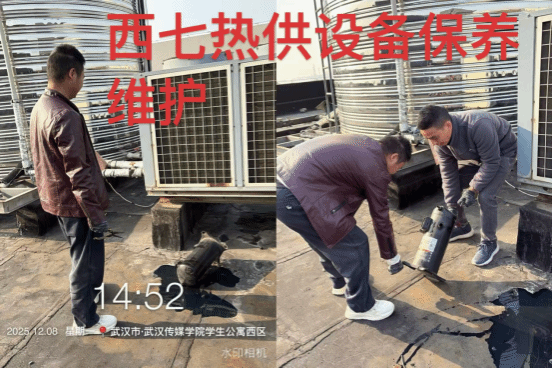 1. 12月8日,武汉校区宿管科委托具有特种设备维护资质的第三方专业团队,对西7教学楼顶的热供系统开展专项保养维护工作。