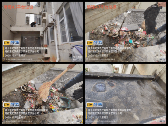 3. 12月17日,武汉校区宿管科组织各楼栋宿管员,对各学生宿舍入口的平台展开清理工作。
