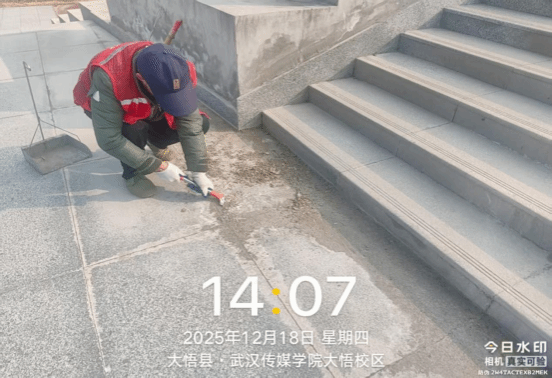 8. 12月18日,大悟校区保洁员工充分利用工作间隙,针对校内公共区域存在的顽固污渍展开集中清除作业。