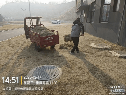 11. 本周,大悟校区绿化人员,对校内草坪及灌木开展修剪作业,并清理修剪产生的残枝败叶等杂物。