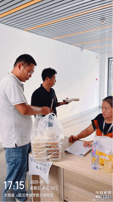 物业科科长张子豪在工作间隙,主动为各楼栋值守教职工送去温热盒饭。他步履匆匆、笑容温暖,递出的不仅是一份餐食,更是一份关怀。宿管员们也主动上前,帮助家长搬运沉重行李,一步步稳健拾级而上,无声传递着温暖。