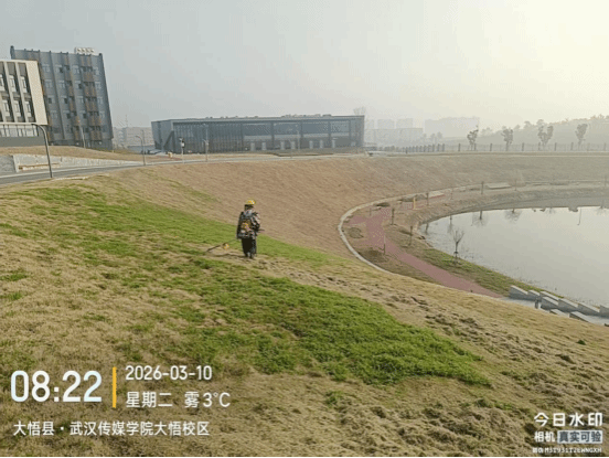 14. 本周,武汉校区绿化团队依据既定的校园绿化养护计划,组织专业人员,针对校内草坪开展修剪与打药工作。