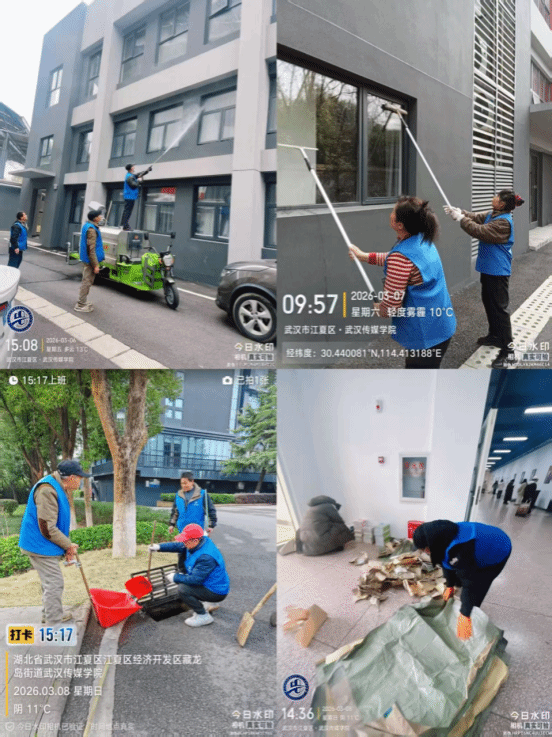 13. 本周,武汉校区保洁队组织人员对9#教学楼玻璃进行了冲洗清洁;同时,对校园内各个雨水井展开了全面排查与疏通清理工作,将井内堆积的淤泥与落叶彻底清除。