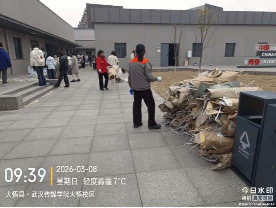 2. 3月8日,学生领取书本后,大悟校区物业科李队长第一时间组织保洁队员对现场展开清理工作,并在清理完毕后联系清运师傅将产生的垃圾及时运走。