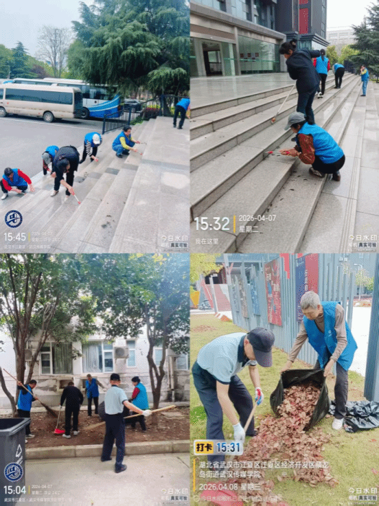 3. 4月7日,武汉校区物业科保洁队组织工作人员铲除行政楼楼梯缝隙杂草、清理卫生死角,并全面清扫绿化带落叶杂物。