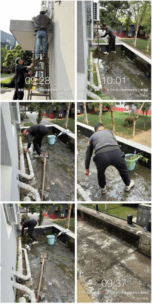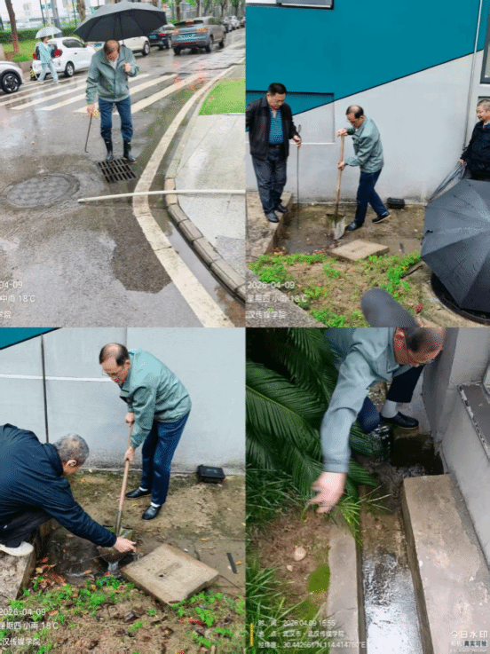10. 4月9日,武汉强降雨,武汉校区物业科维修队巡查行政楼花园、5号教学楼门口等低洼易涝点并疏通排水。