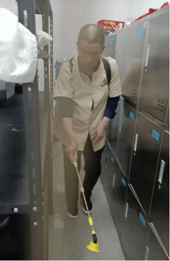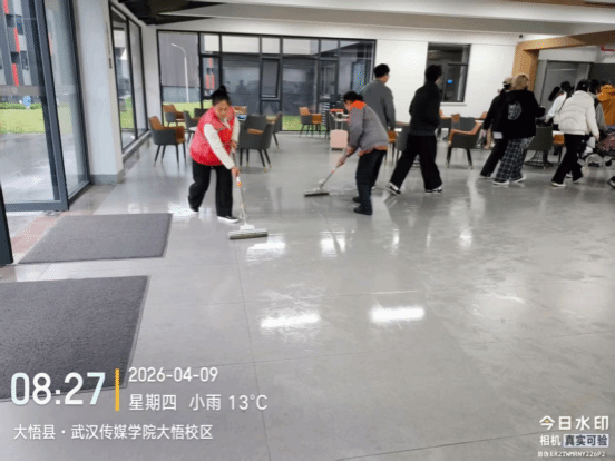 11. 4月9日,为防止师生在雨天滑倒,大悟校区保洁员工积极清理入口通道水渍,。