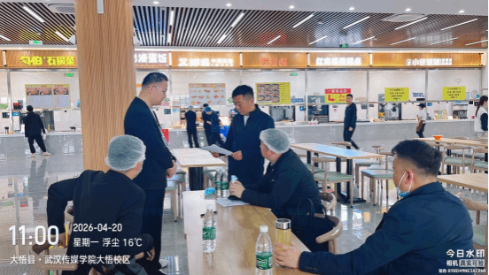 4. 4月20日,春季校园食品安全交叉检查组进驻大悟县,对全县16所学校开展专项检查。大悟校区食堂全面迎检,重点落实食堂环境卫生彻底清洁、监控设备全覆盖无盲区、从业人员严格“三穿一戴”规范着装,以及完善索证索票、留样消毒等台账管理。