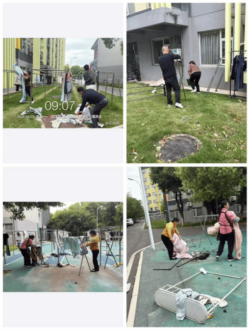 2. 4月20日,武汉校区宿管科楼长携手宿管员自发对学生晾晒区进行整理。