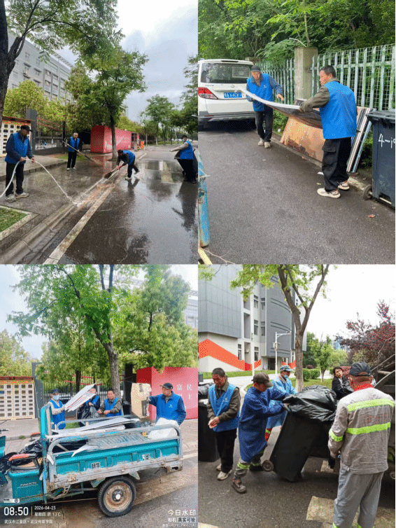 13. 4月23日,武汉校区保洁队组织工作人员开展了专项环境整治行动,集中清理校园内展板、宿舍床垫等大件垃圾,并对路面进行全面冲洗保洁。